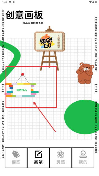 2、切換到創(chuàng)意畫板頁,點(diǎn)擊我的作品入口,可查看過往繪畫創(chuàng)作,繼續(xù)拓展創(chuàng)意涂色無限可能。