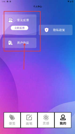 3、在個人中心頁面,點(diǎn)擊用戶協(xié)議選項(xiàng),了解平臺規(guī)則,也可通過意見反饋提交使用建議。