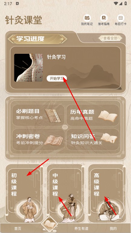 2、切換到針灸課堂頁,選課程級別,點擊開始學習,進入針灸學習,還能利用必刷題目等題庫資源刷題,學練結合提升知識掌握度。