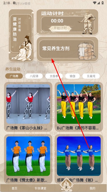 3、進入養(yǎng)生有道頁,查看常見養(yǎng)生方劑,學習養(yǎng)生知識,參與養(yǎng)生運動,同時可借助運動計時功能輔助鍛煉,全方位學習中醫(yī)針灸與養(yǎng)生內容。