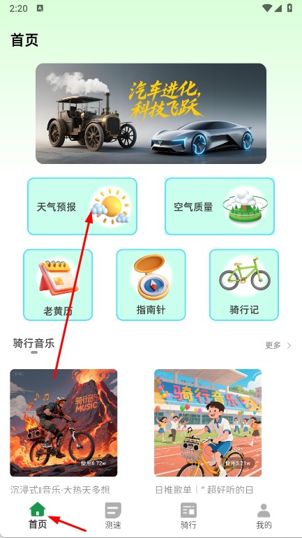 1、打開行者騎行app,在首頁使用多樣功能,如點天氣預(yù)報了解天氣,選騎行音樂添樂趣,還能看騎行博主分享的生活。