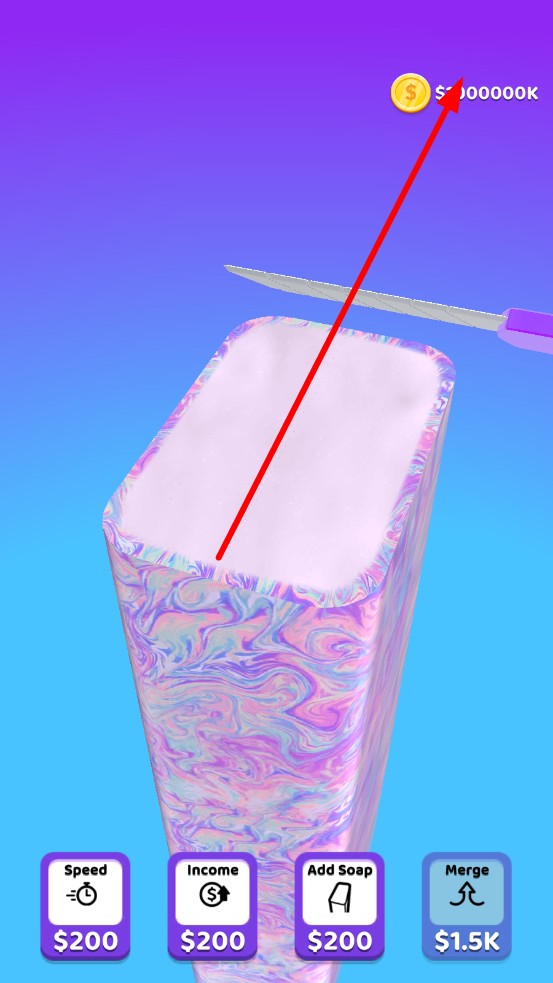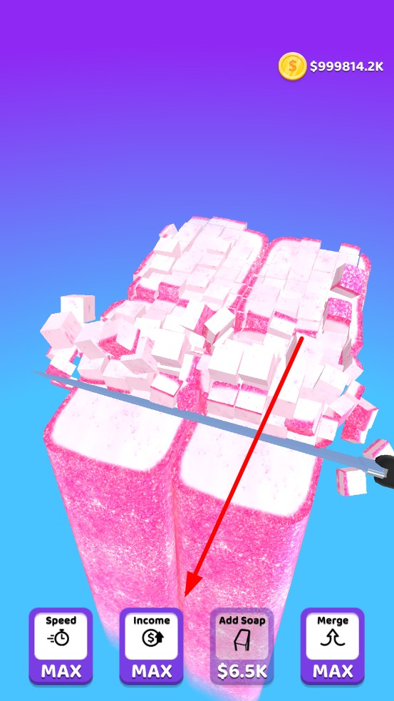 3、消耗金幣升級Speed,加快切割頻率、Income,提升單刀收益、Add Soap,增加同時切割的肥皂數(shù),或點擊Merge合并肥皂,解鎖新造型。