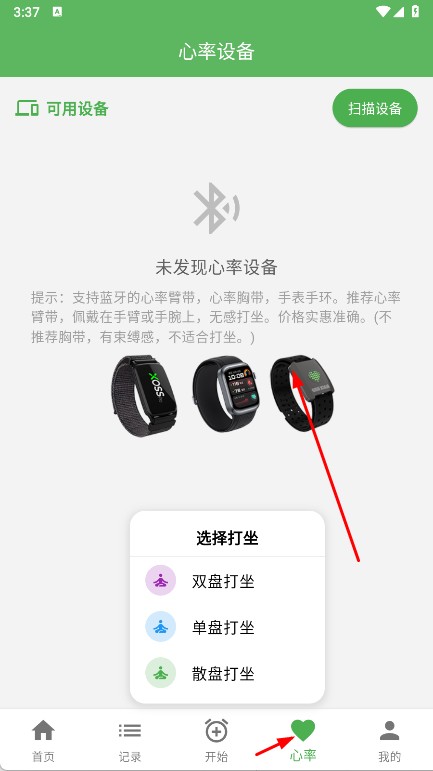 3、在心率頁(yè),掃描連接心率設(shè)備,選打坐類(lèi)型記錄心率,通過(guò)記錄頁(yè)查看歷史數(shù)據(jù),了解進(jìn)步情況。