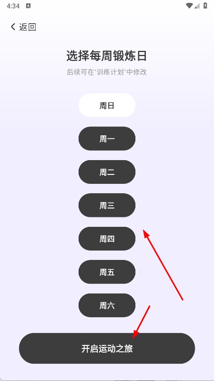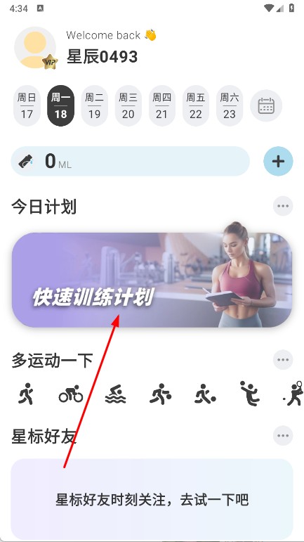 1、打開星辰運動,在首頁點擊快速訓練計劃,選擇每周鍛煉日,點擊開啟運動之旅。