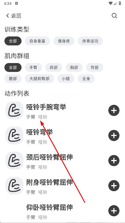 2、進入訓練類型頁面,按訓練類型,肌肉群組篩選,添加動作到計劃。