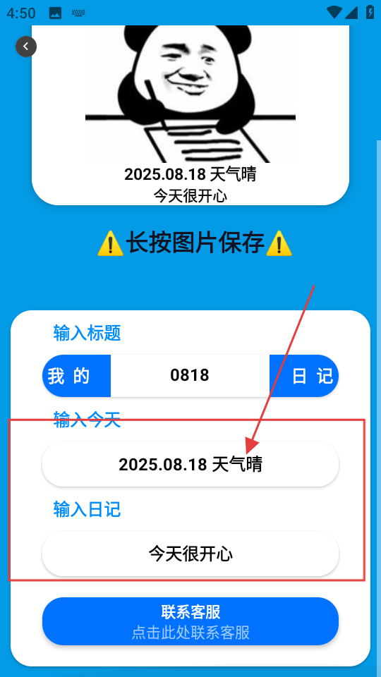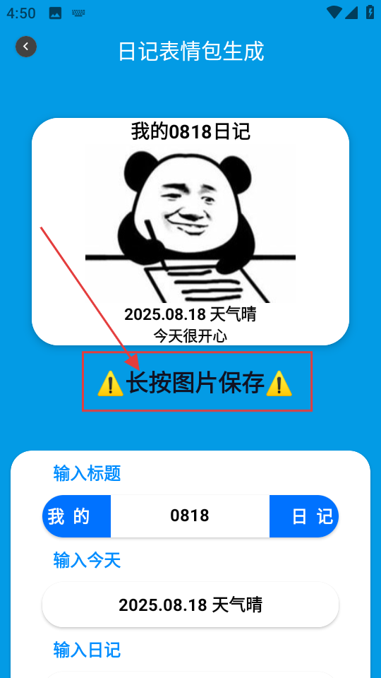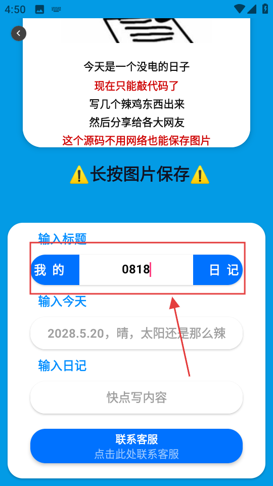 1、輸入標(biāo)題,像我的0818日記這樣,還能在輸入今天和輸入日記的框里填寫內(nèi)容,之后就能生成對(duì)應(yīng)的圖片,而且這個(gè)源碼不用網(wǎng)絡(luò)也能保存圖片很方便。