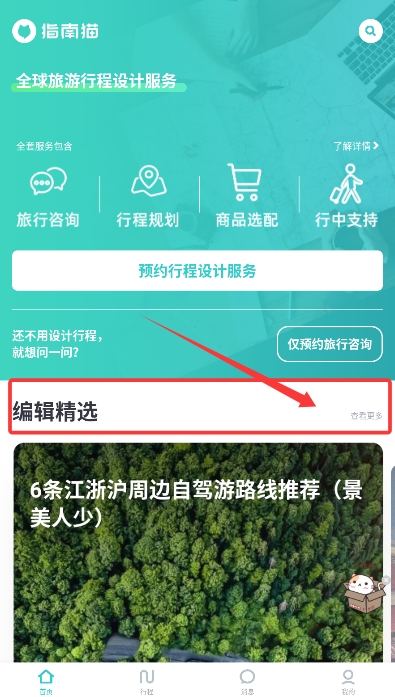 1、登錄指南貓旅行應(yīng)用后,在主頁(yè)編輯精選查看更多,即可進(jìn)行查詢。