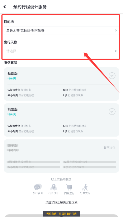 4、填寫出行日期、人數(shù)等需求,選擇合適方案后提交預(yù)約申請(qǐng)。