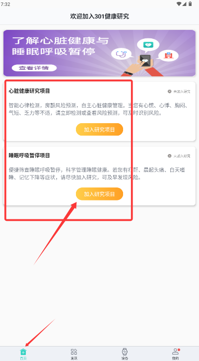 1、啟動(dòng)應(yīng)用后,首頁(yè)展示心臟健康與睡眠研究入口,點(diǎn)擊按鈕即可報(bào)名參與。
