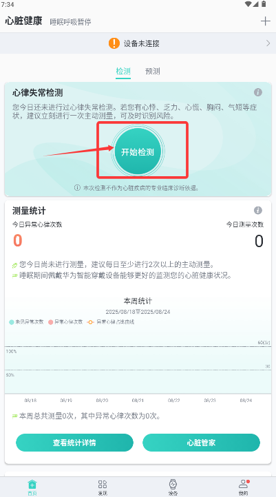 2、進(jìn)入心臟監(jiān)測(cè)界面,輕觸檢測(cè)按鈕就能進(jìn)行心律失常篩查。