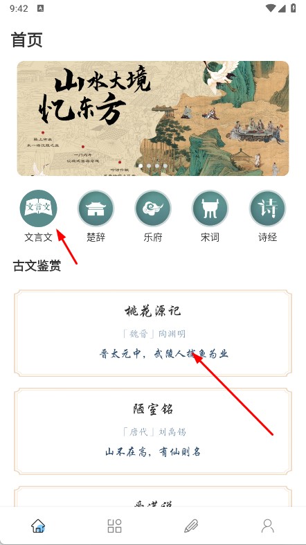 1、打開文言文翻譯器轉(zhuǎn)換,在首頁選文言文分類,點擊文章內(nèi)容,可使用翻譯功能,將文言文轉(zhuǎn)通俗語言,輔助學(xué)習(xí)。