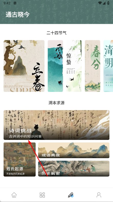 3、進入知識板塊,參與詩詞挑戰(zhàn),通過翻譯器輔助,學(xué)習(xí)詩經(jīng)、樂府、唐詩宋詞等。