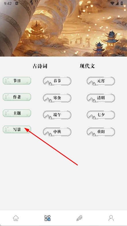 2、切換到對應(yīng)頁面,按古詩詞,現(xiàn)代文分類,查找詩詞文章,借助翻譯理解內(nèi)容,深入學(xué)習(xí)。