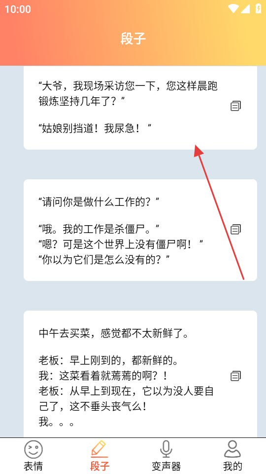 1、在段子頁面,能看到好多有趣的段子,像關(guān)于晨跑大爺和買菜的這些,讀起來能讓人樂一樂,你可以在這里瀏覽這些段子,打發(fā)時間,要是看到喜歡的,還能和朋友分享。