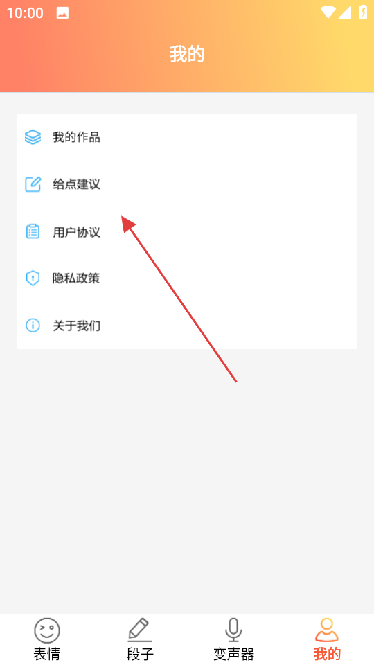 3、我的頁面里,能查看自己的作品,也可以給軟件提建議,要是你對軟件有什么想法或者發(fā)現(xiàn)問題,就可以通過給點(diǎn)建議這個選項(xiàng)反饋,這樣能幫助軟件變得更好用。