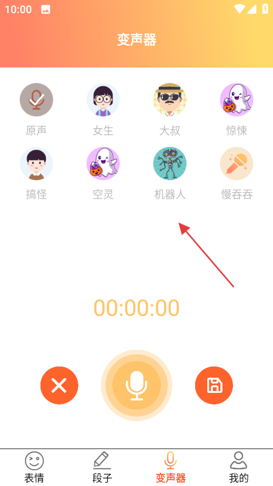 2、變聲器頁面提供了好幾種變聲效果,有女生,大叔,驚悚等不同風(fēng)格,你可以選擇喜歡的變聲效果,然后點(diǎn)擊中間的麥克風(fēng)按鈕錄音,錄好后就能聽到變聲后的聲音,很有意思。