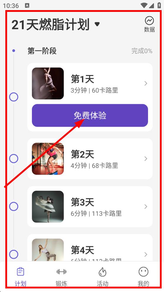 1、進(jìn)入21天燃脂計(jì)劃】,點(diǎn)擊第1天課程下的免費(fèi)體驗(yàn)的按鈕,開啟燃脂計(jì)劃首天訓(xùn)練。
