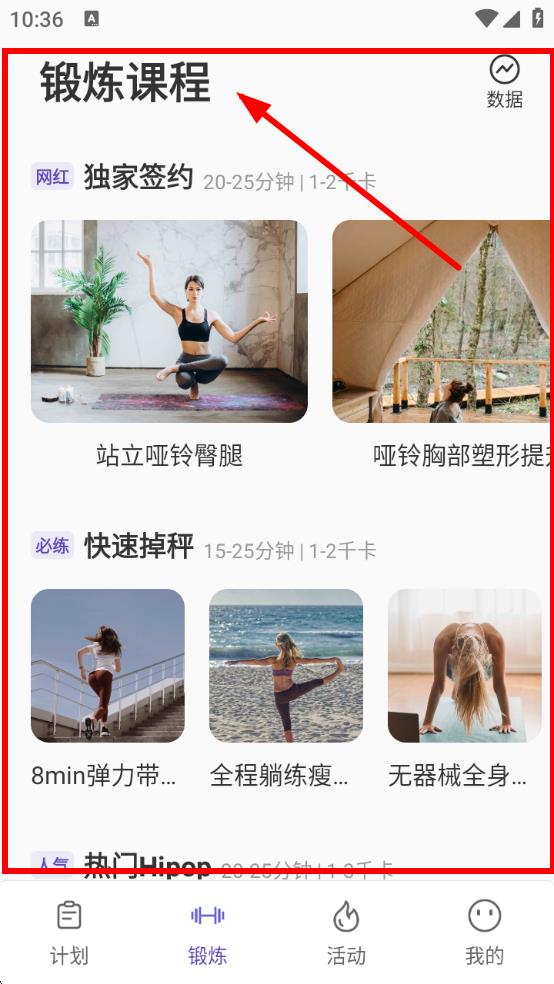 2、切換到【鍛煉】頁(yè),瀏覽【鍛煉課程】,選站立啞鈴?fù)瓮鹊日n程,點(diǎn)擊進(jìn)入開始鍛煉。