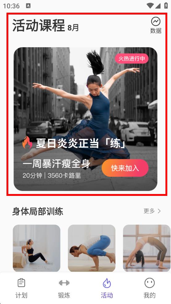 3、在活動(dòng)頁(yè),找到【活動(dòng)課程 8 月】,點(diǎn)擊快來加入?yún)⑴c一周的暴汗瘦全身活動(dòng)課程。