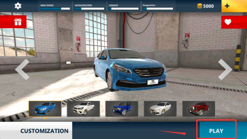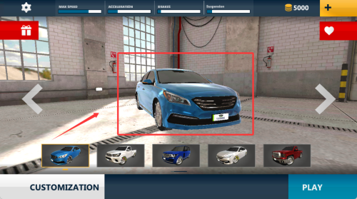 1、進(jìn)入車庫界面瀏覽各類越野車型,通過左右滑動查看詳細(xì)參數(shù),選定適合沙漠地形的座駕。