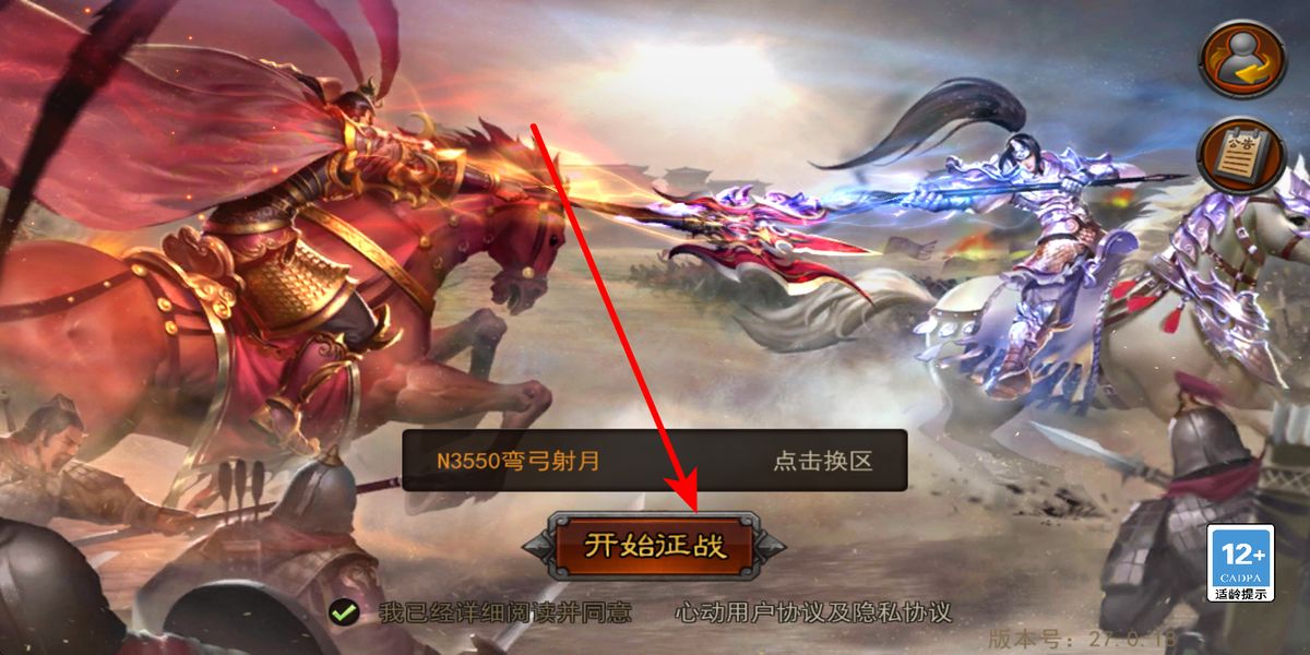 1、開啟征戰(zhàn),在游戲初始界面確認已閱讀并同意相關(guān)協(xié)議后,點擊開始征戰(zhàn)按鈕,選擇合適戰(zhàn)區(qū),這是進入游戲世界開啟三國冒險的第一步。