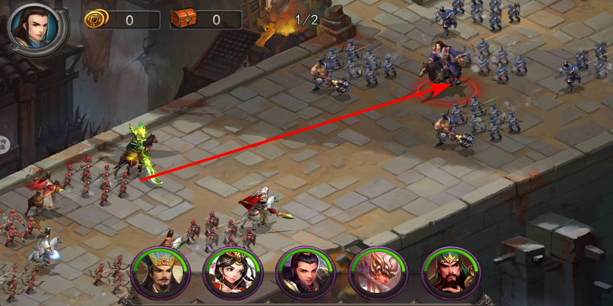 3、指揮戰(zhàn)斗,進入游戲場景后,合理排布武將,根據(jù)戰(zhàn)場局勢,點擊對應(yīng)武將操控其釋放技能,通過調(diào)兵遣將擊敗敵軍,奪取戰(zhàn)斗勝利。