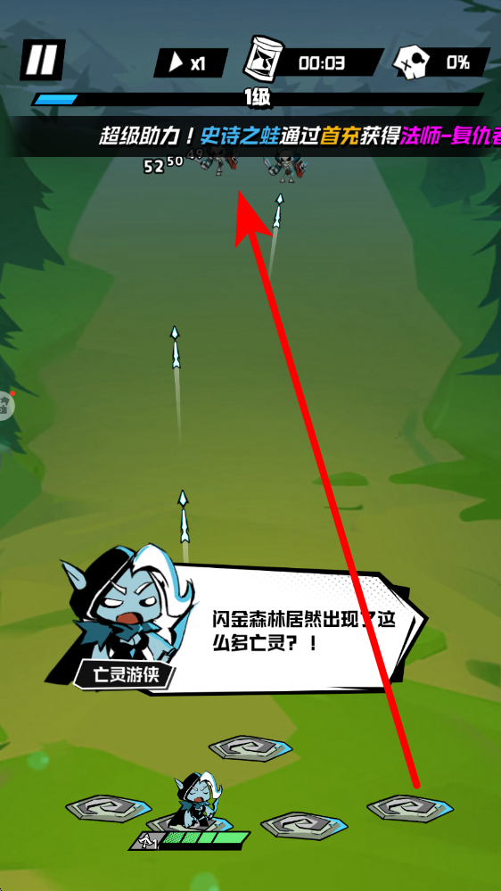 2、選好英雄進入戰(zhàn)斗,場景為閃金森林,會出現(xiàn)大量亡靈敵人,操控角色利用技能,瞄準亡靈發(fā)射箭矢,注意躲避敵人攻擊,保障生存與輸出。
