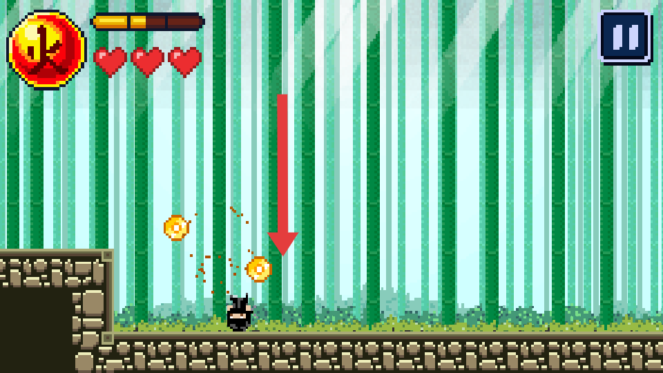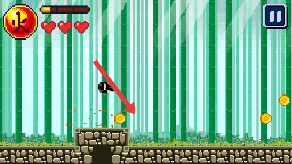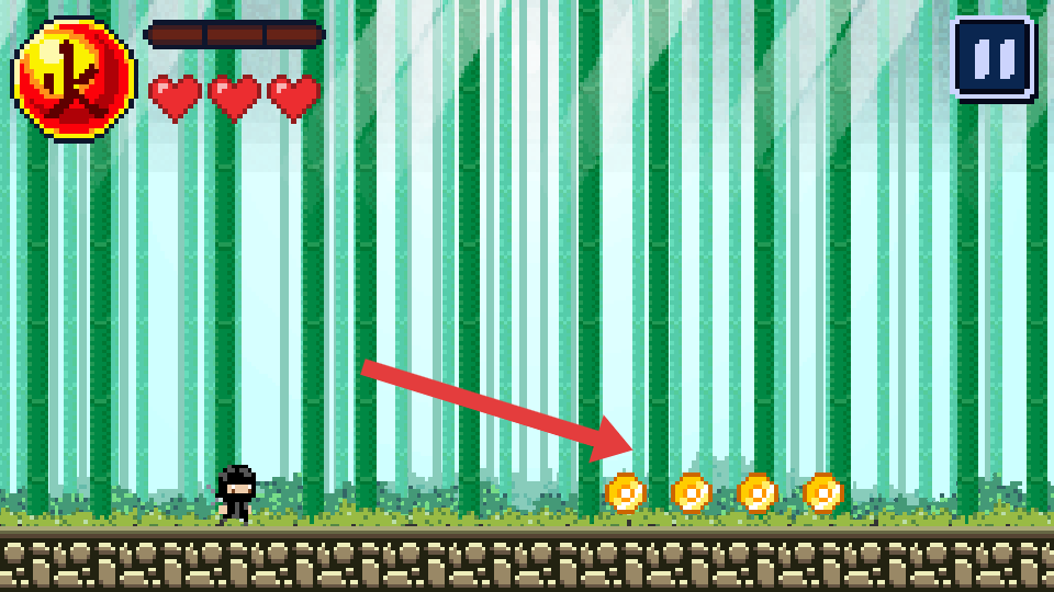 1、進入游戲,操控忍者向右移動,遇到金幣黃色圓形靠近自動收集,注意上方血量愛心和能量條。