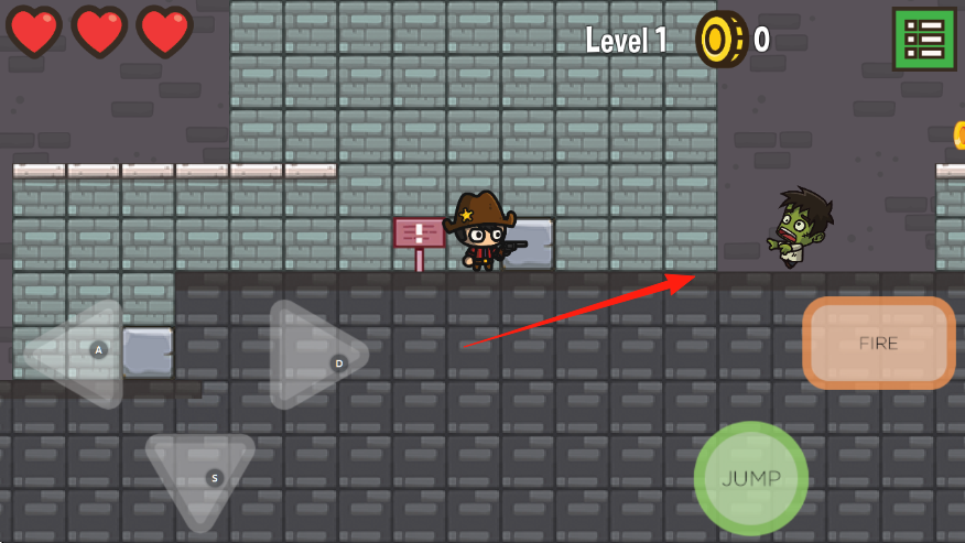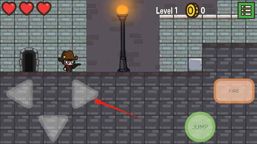 1、點(diǎn)擊屏幕左下方的方向鍵如紅箭頭所指,控制牛仔角色左右移動(dòng),探索關(guān)卡場(chǎng)景。