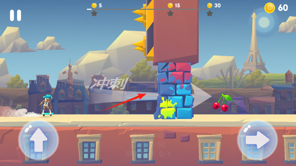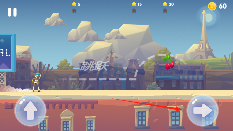 3、遇到較高的障礙物或者需要到達(dá)更高位置時,點擊屏幕左下角的上箭頭按鈕,讓角色跳躍,通過合理的跳躍躲避障礙并收集空中的櫻桃等道具。