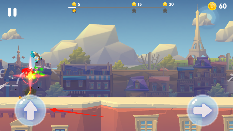 1、點擊屏幕右下角的右箭頭按鈕紅箭頭所指,控制角色向右移動前進(jìn),在跑酷過程中收集金幣和道具。