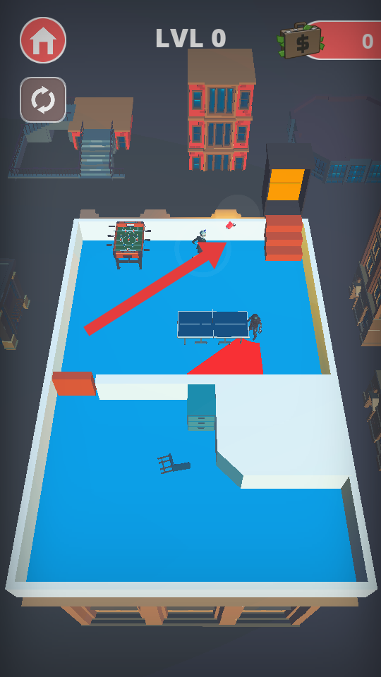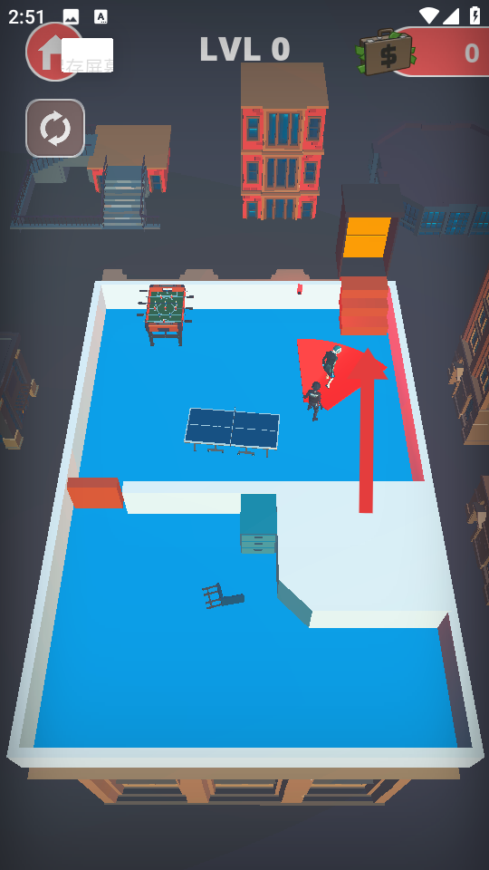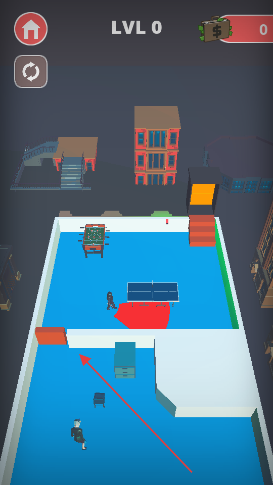 1、進入開始的關卡,操控黑衣角色,利用場景物品如乒乓球桌、柜子遮擋,避開敵人白衣角色紅色視野。
