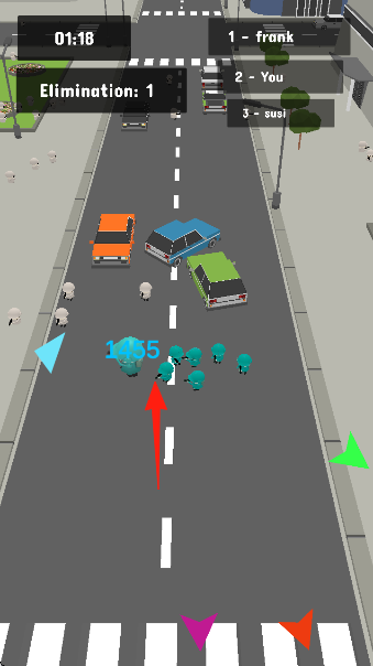 1、操控藍(lán)色人群在街道移動(dòng),注意上方計(jì)時(shí)器和排名,躲避車(chē)輛,收集小羊壯大隊(duì)伍。