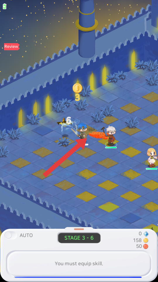 3、推進(jìn)到新關(guān)卡3-6,收集場景金幣,遇到新敵人帶數(shù)字標(biāo)識,調(diào)整技能搭配,重復(fù)戰(zhàn)斗-技能釋放循環(huán)。