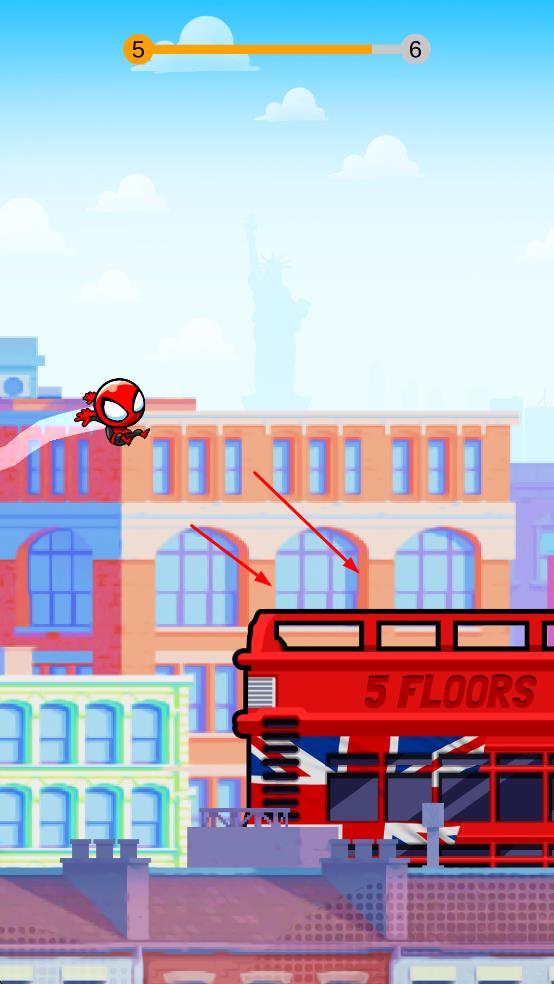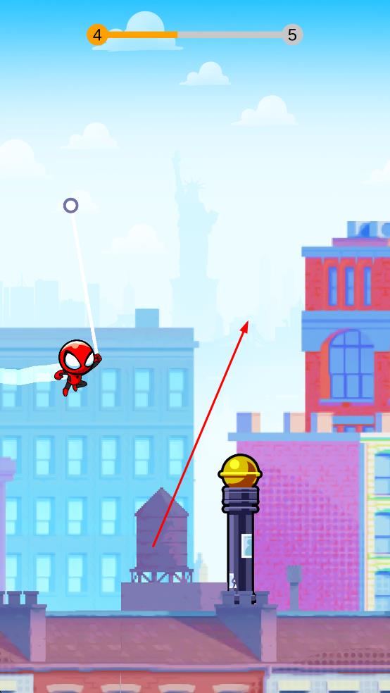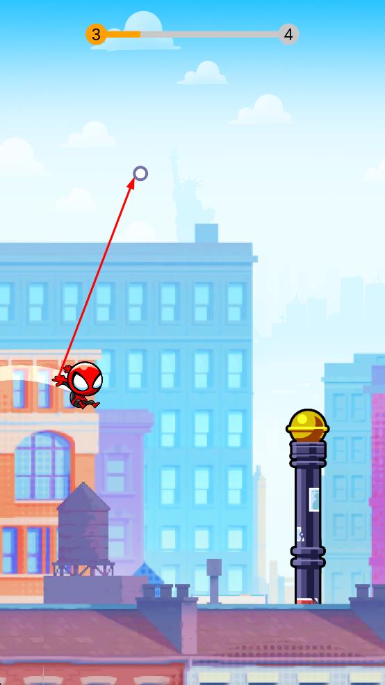 1、操控繩索精準跳躍:玩家通過簡單操作控制蜘蛛俠甩出繩索,瞄準前方合適的落點后釋放繩索完成跳躍,需根據(jù)前方障礙物與平臺距離調(diào)整跳躍力度與時機,確保順利前進不落地。