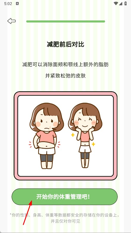 1、打開減肥21天燃脂記,點(diǎn)擊開始你的體重管理吧,錄入初始體重等信息,開啟減肥旅程。