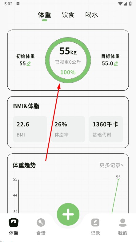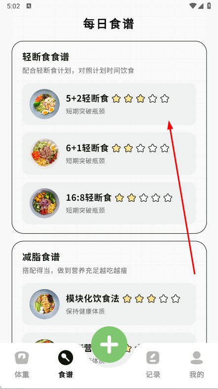 2、在體重頁,查看體重、BMI、體脂率等數(shù)據(jù),了解身體狀態(tài),切換到食譜頁,選輕斷食,減脂食譜,控制熱量攝入。