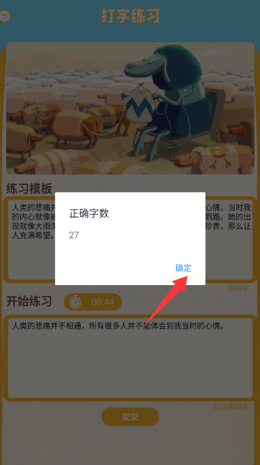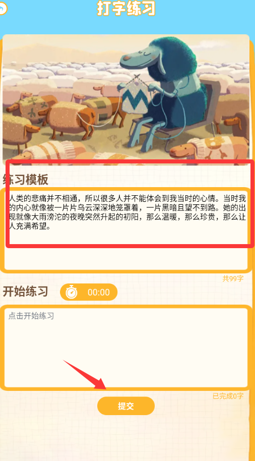 3、點擊開始練習(xí),打上面紅色框框的字打完點擊提交。