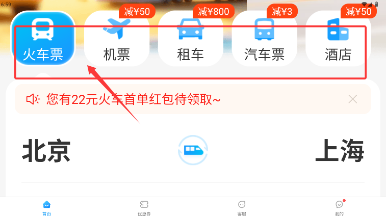 1、啟動(dòng)應(yīng)用后,在首頁上方選擇“火車票”服務(wù),進(jìn)入訂票界面。