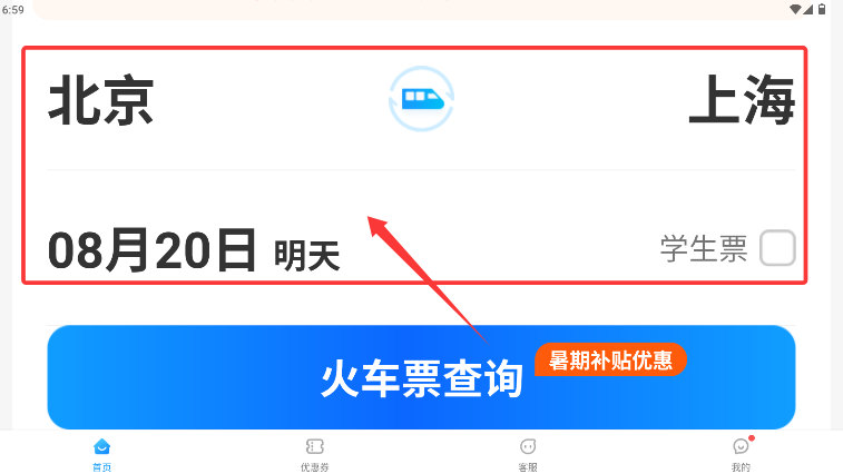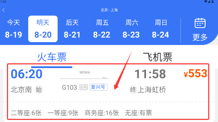 2、設(shè)定出發(fā)城市為北京,到達(dá)站為上海,可自由調(diào)整日期。