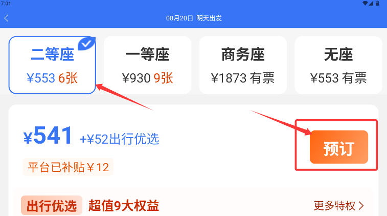 4、點(diǎn)選二等座,核對(duì)票價(jià)無誤后提交預(yù)訂,即可完成購票流程。