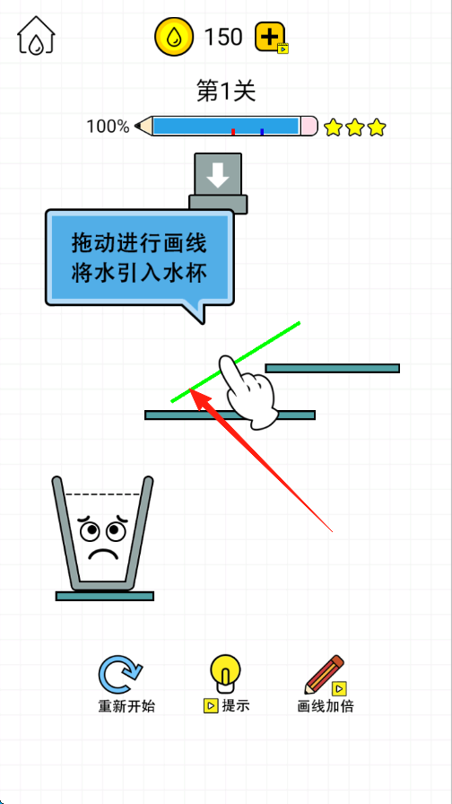 1、進(jìn)入第1關(guān),按藍(lán)色氣泡提示【拖動進(jìn)行畫線將水引入水杯】,用手指拖動屏幕畫線,規(guī)劃水流引導(dǎo)路徑。