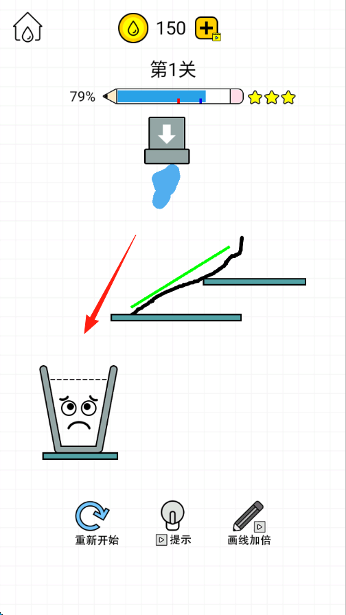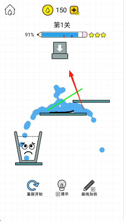 3、持續(xù)觀察水流情況,若水流未按預(yù)期入杯,可點(diǎn)擊【重新開始】調(diào)整線條,直至水杯接水進(jìn)度達(dá)標(biāo)過關(guān)。