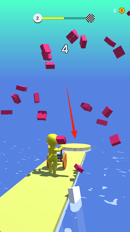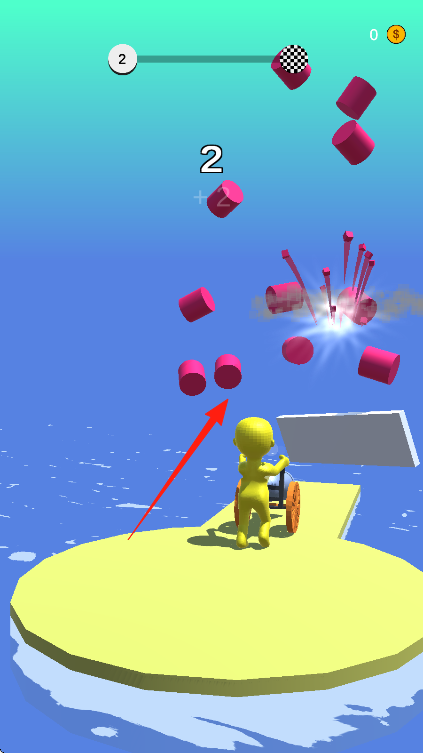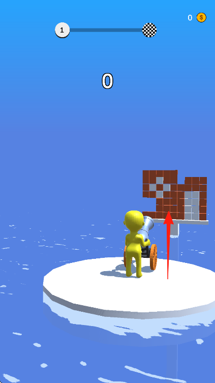 1、進(jìn)入游戲關(guān)卡,黃色小人操控大炮,觀察屏幕上方進(jìn)度條和金幣數(shù)量,點(diǎn)擊大炮瞄準(zhǔn)前方磚塊。