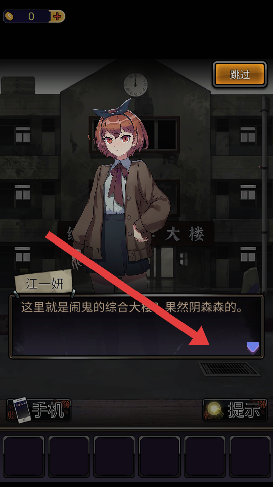 1、開局遇角色江一妍,點(diǎn)擊對(duì)話框推進(jìn)了劇情,了解鬧鬼綜合大樓背景的劇情,熟悉基礎(chǔ)的交互。