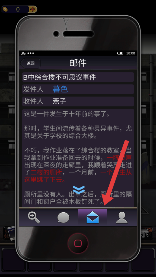 2、點(diǎn)擊手機(jī)查看郵件,獲取B中綜合樓靈異事件線索十年前女生跳樓、廁所被封,標(biāo)記關(guān)鍵信息。