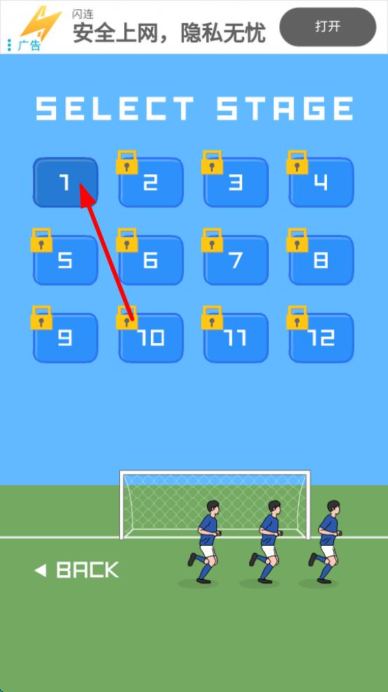 1、進入游戲后選定關(guān)卡,仔細觀察當前關(guān)卡的防守布局和球門位置,點擊并拖動屏幕調(diào)整射門的角度與力度,做好射門準備。