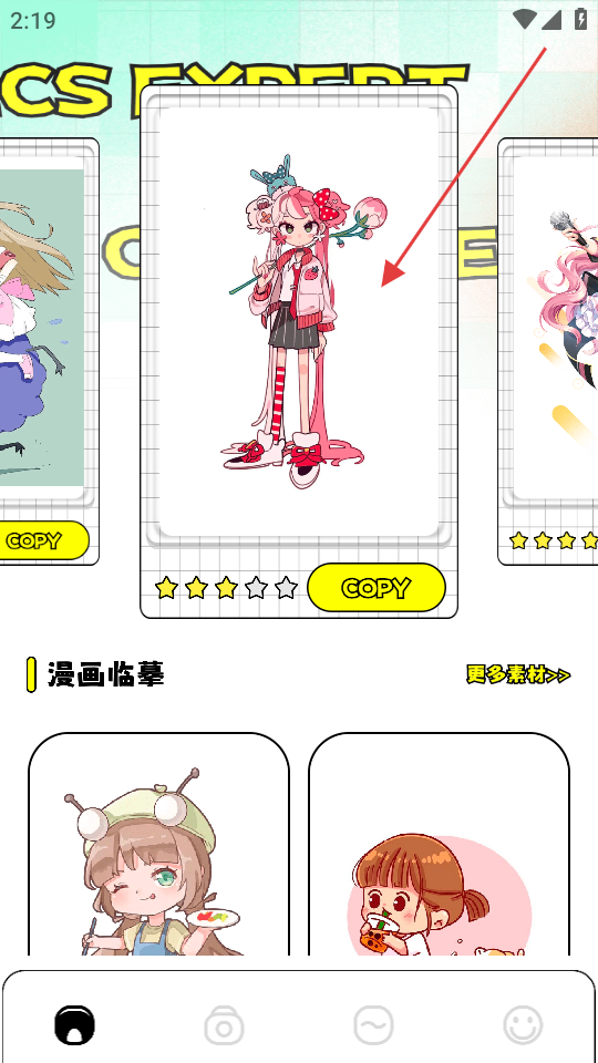 1、這個軟件的每個形象下面都有COPY按鈕,看到喜歡的形象點擊COPY,就能把這個形象相關的畫下來,還能看到形象的星級評分,了解大家對它的喜愛程度。