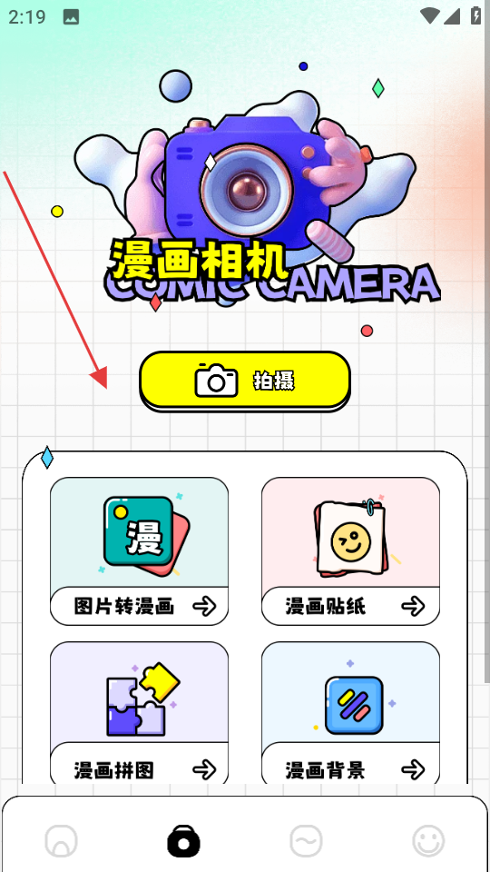 3、在漫畫相機頁面,有拍攝按鈕,還有圖片轉漫畫、漫畫貼紙等功能選項,點擊拍攝可以直接拍攝照片并將其轉化為漫畫風格,另外還有漫畫拼圖、漫畫背景等功能。