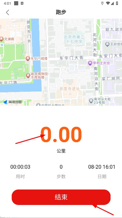 3、跑步結(jié)束后,點(diǎn)擊結(jié)束,在運(yùn)動(dòng)記錄查看數(shù)據(jù),掌握運(yùn)動(dòng)情況,參與更多健康跑,管理健康。